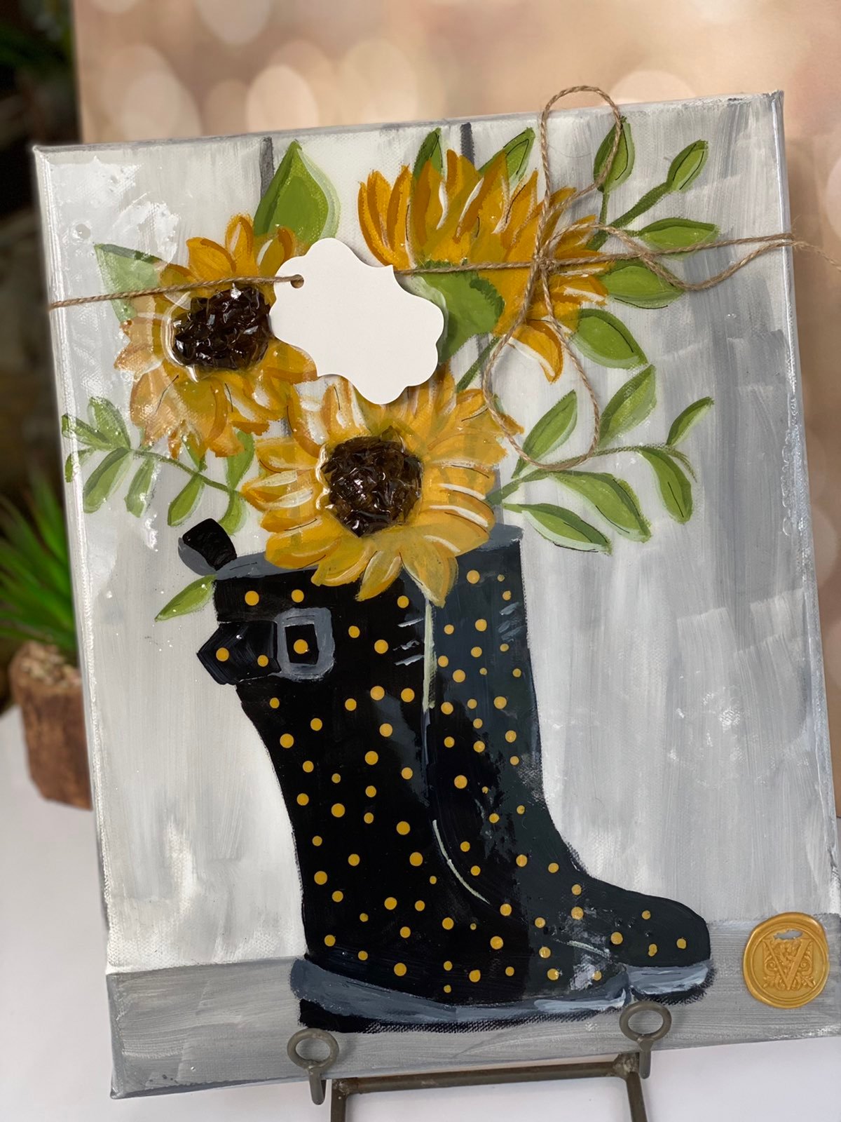 This is a brand new handpainted rainboots and sunflowers . Beautiful 11x14 piece , an extremely nice piece to show off at your home. The flowers have brown crushed glass inside the flowers , and the whole piece is covered with resin , what gives the piece a nice pop of color .