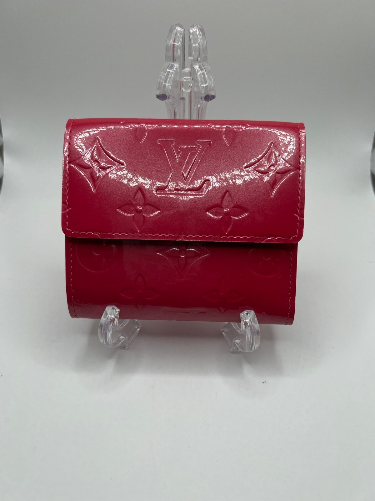 This is an amazing authentic LOUIS VUITTON Vernis Ludlow Wallet in Framboise. This is a compact coin purse crafted of Louis Vuitton monogram embossed Vernis patent leather in pink. It has a flap coin purse with gusseted sides on one side and a compartment with three card slots on the other.