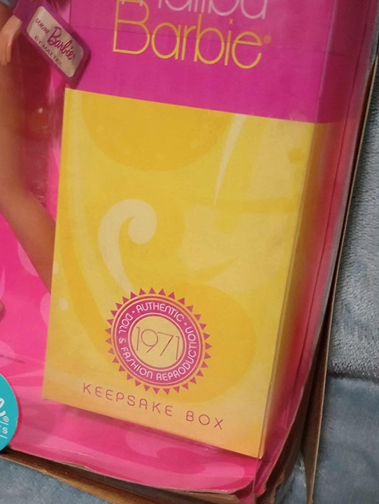 She taught you all about fun in the sun with her cool West Coast attitude. Now the quintessential California girl is back! A wonderful reproduction of the 1971 doll, Malibu Barbie doll is authentically recreated in her aqua blue bathing suit. Yellow towel and sunglasses complete the beach ensemble, updated with an accompanying "sunscreen" bottle.