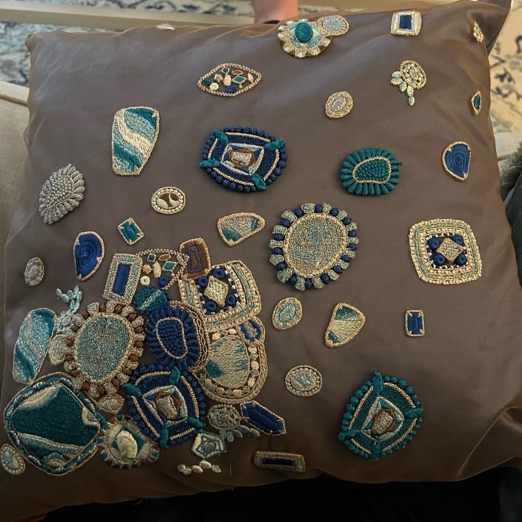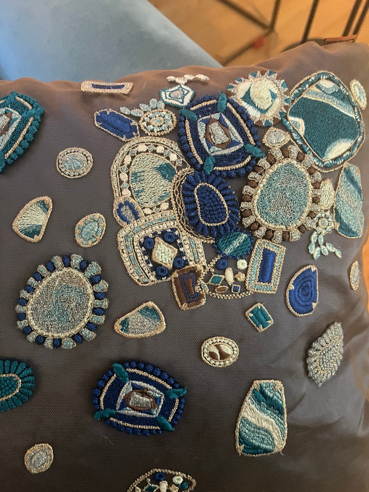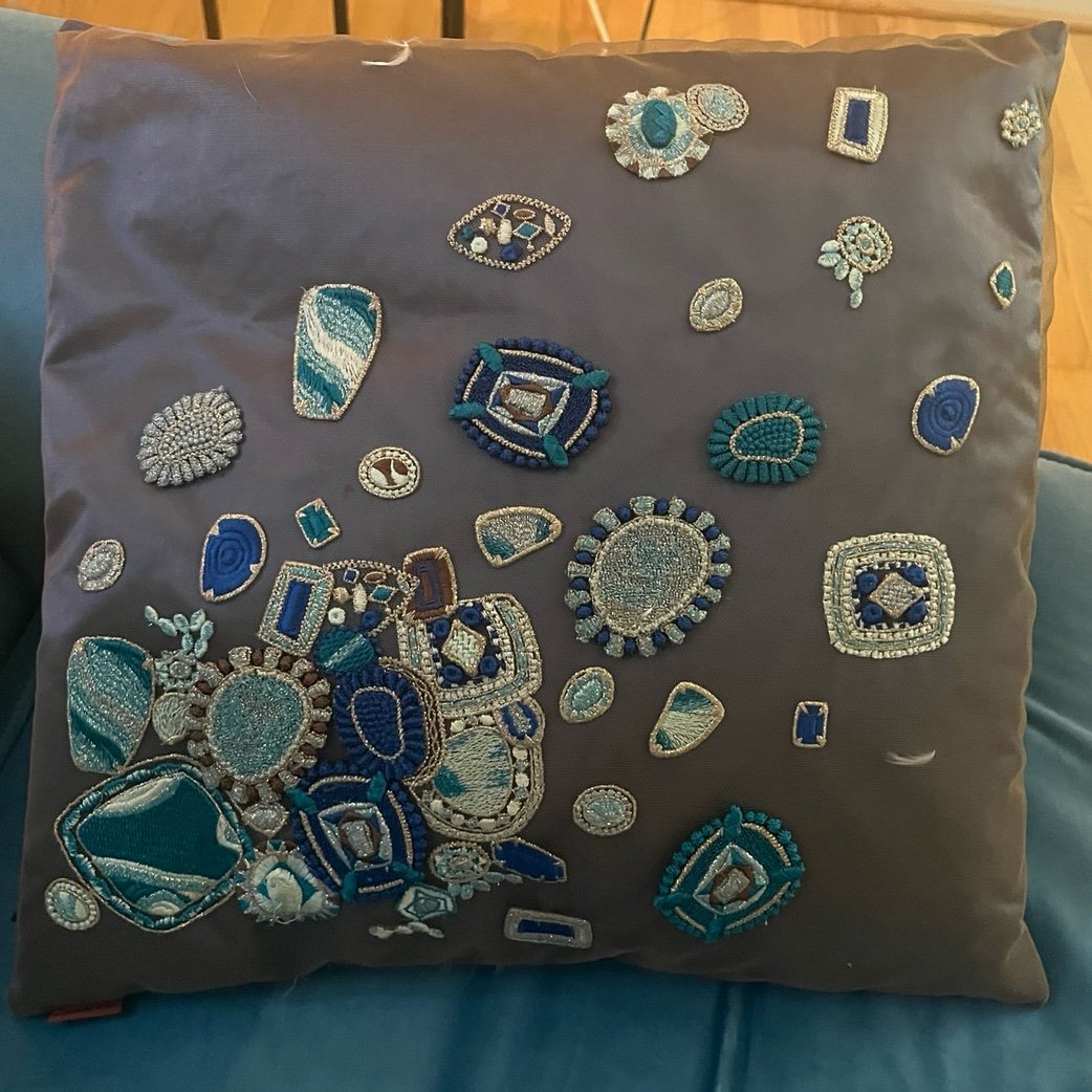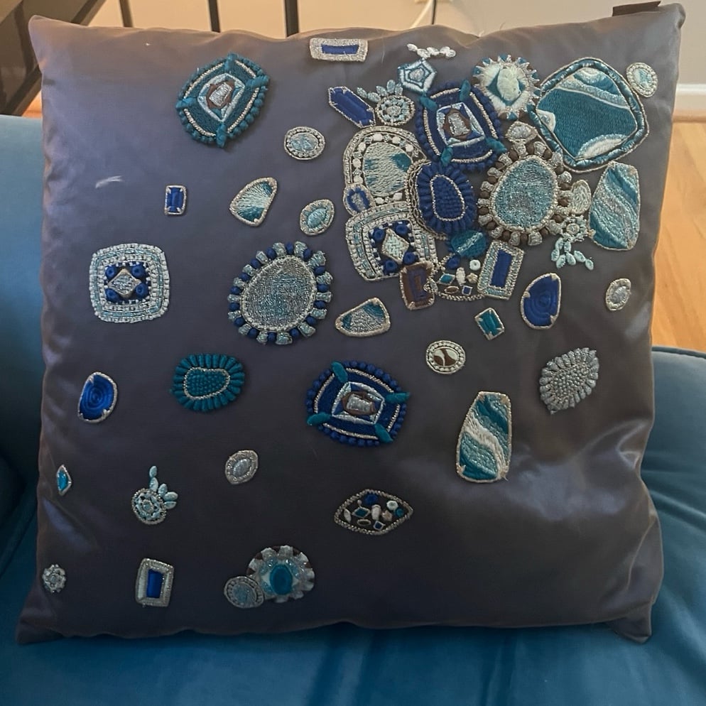 Blue silk with mesh cover and blue/gold embroidery, hand-woven. Cushion zips off for easy dry clean.