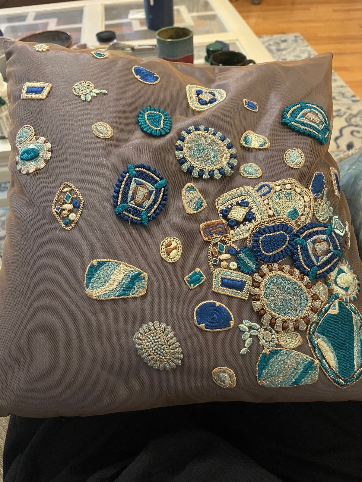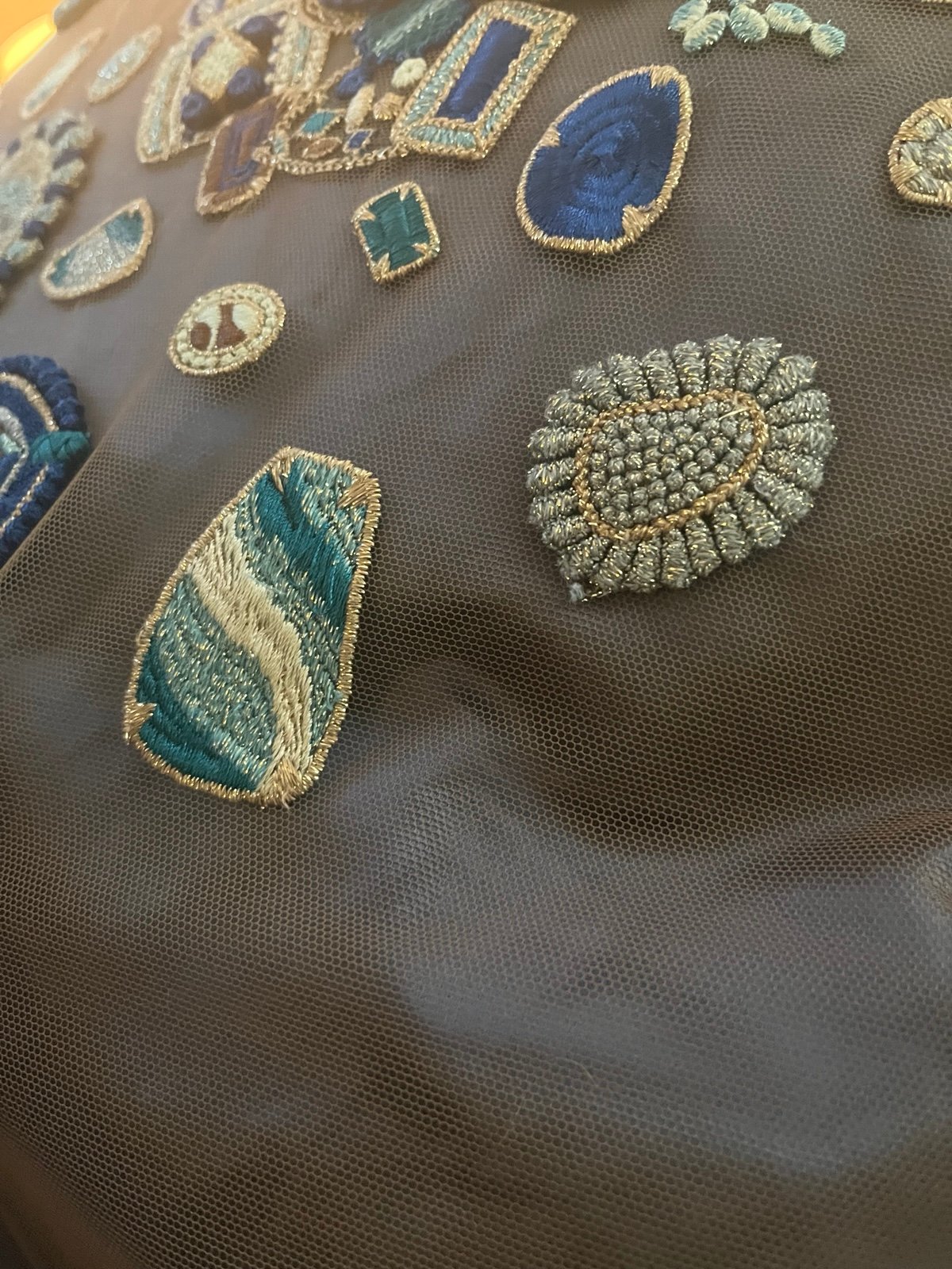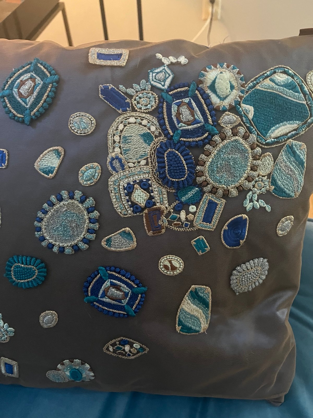 Blue silk with mesh cover and blue/gold embroidery, hand-woven. Cushion zips off for easy dry clean.