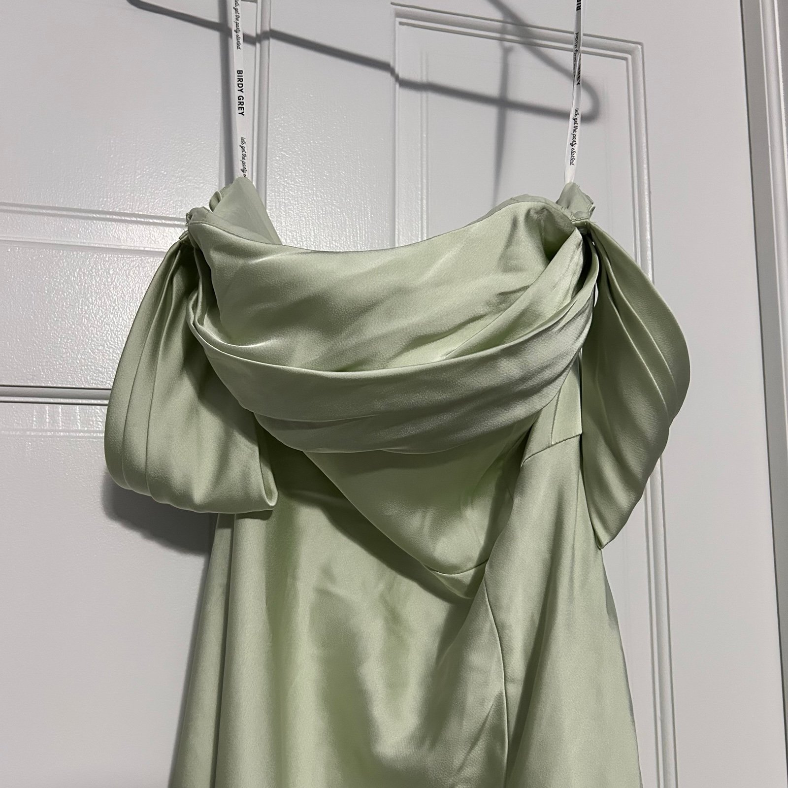 NWT size small Mia convertible bridesmaid dress from Birdy Grey. Color is pale pistachio in matte satin. Has draped sleeves which can be removed and converted to strapless or spaghetti straps with attachable spaghetti straps. Versatile for style desired.